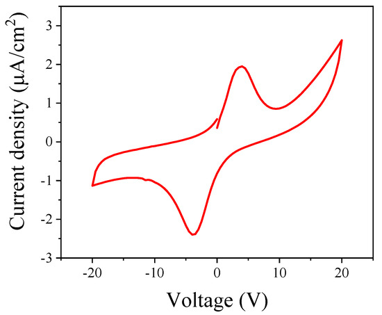 Generally, its surface potential can be regulated by adopting Ec three times to acquire an electric domain structure in a ferroelectric film. As an important ferroelectric film with interface polarization function, the leakage current of the PZT sample was ~ 2.6 µA/cm2 at ~540 kV/cm electric field intensity (as shown in Figure 3). The results exhibit impressive insulation properties, which can ensure a lower charge perturbation for further TFT (thin film transistor) integrated applications [36,37].