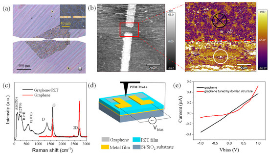 Combining with a follow-up lift-off and metal film deposition process, a graphene/PZT-integrated film transistor was fabricated (Figure 6d). The domain structure can be written by a PFM probe between two electrodes on the surface of PZT film. The opposite domain direction can lead to surface potential (~0.3 V) in our film sample. Up/down with different phases can further regulate graphene in the channel to construct the p-doping and n-doping of graphene. The current output curve of pure graphene was a symmetrical distribution with the bias voltage changing from −1 to 1 V. When graphene (Kelvin probe force microscopy) was placed on the surface of PZT film containing a domain structure with opposite orientation (Figure 6e), the domain orientation of the PZT film result in an opposite external electric field. Polarization of the electric field will lead to positive/negative charges and Fermi-level change. Then, the graphene sample has finished the conversion of the p-type and n-type. With the hole and electron movement in the p-type and n-type area of the graphene sample, a built-in electric field was produced in the graphene film. The p-n junction only allows the current to flow in one direction, so a slight rectification characteristic curve is presented in Figure 6e. In addition, the perovskite crystal type of PZT film based on Raman and XRD characterization implies a huge application prospect in the field of photoelectric integrated devices.