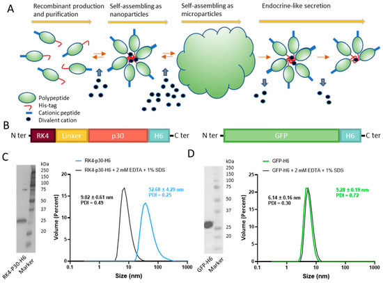 Construction and characterization of RK4-P30-H6 and GFP-H6. (A) Architectonic principles governing the POM principle, namely microparticle generation out of nanoparticles and further nanoparticle release. His-tagged proteins tend to self-assemble, upon recombinant production and Ni2+-based purification, into oligomeric nanoparticles, assisted by divalent cations. A cationic amino acid N-terminal stretch favors this process. The addition of a molar excess of cationic Zn produces the immediate formation of microscale particles. Upon in vivo administration and upon Zn dilution, these materials release stable nanoparticles differently. (B) Schematic representation of RK4-P30-H6 and GFP-H6 constructs. In RK4-P30-H6, a flexible peptide linker (GGSSRSS) was incorporated. (C) RK4-P30-H6 characterization by H6 immunodetection in Western blot with anti-His monoclonal antibody ((C), left). Size of the purified protein determined by DLS. The protein size was also measured under chelating conditions (2 mM EDTA + 1% SDS) ((C), right). (D) Immunodetection of GFP-H6 by Western Blot ((D), left) and size of the construct analyzed by DLS ((D), right).