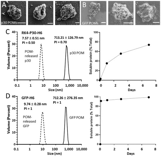 Formation and characterization of p30 POMs and GFP POMs. Representative micrographs of p30 POMs (A) and GFP POMs (B) obtained by SEM (scale bar represents 1 µm). (C) Size of p30 POMs and of the soluble protein released in vitro after seven days as determined by DLS (left). The relative amount of soluble protein released from p30 POMs for seven days is also shown (right). (D) Size of GFP POMs and of the soluble protein released from these microparticles as determined by DLS at day seven (left). The relative amount of soluble protein released from GFP POMs for seven days is also depicted (right).