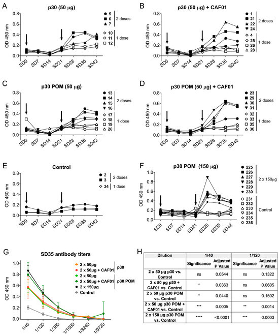 Subcutaneous inoculation of p30 secretory granules in pigs induces ASFV-specific antibodies. ASFV-specific IgGs in sera from pigs inoculated with 50 µg of p30 Soluble (A) without or (B) with CAF01, or with 50 µg of p30 POMs (C) without or (D) with CAF01, and (E) the control group. (F) ASFV-specific IgGs in sera from pigs receiving 150 µg of p30 POMs or PBS as control from the second experiment. Arrows indicate the two vaccination days. (G) ASFV-specific IgG titers in pig sera two weeks after the second administration (SD35). (H) Statistical analyses of ASFV-specific IgG titers in pig sera two weeks after the second administration (SD35). Statistical significance was determined by one-way ANOVA followed by Tukey’s multiple comparisons test and is displayed in GraphPad style (ns p > 0.05, * p ≤ 0.05, ** p ≤ 0.01, *** p ≤ 0.001, **** p ≤ 0.0001).