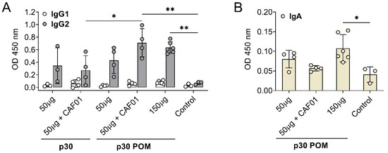 Notably, significant levels of ASFV-specific IgA were only found in serum after administration of the higher 150 µg p30 POMs amount (Figure 4B), stressing the importance of an adequate dose.