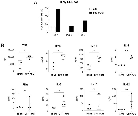 In vitro stimulation with POMs induces non-specific cell activation. (A) IFNγ-producing PBMCs from three naive pigs measured by ELISpot assay. Cells were stimulated in vitro with 5 µg/mL of p30 or p30 POMs. (B) Cytokine levels in culture supernatants of PAMs stimulated in vitro for 24 h with 5 µg/mL of GFP POMs or left unstimulated (RPMI) quantified by Luminex-based multiplex assay. Statistical significance was determined by unpaired two-tailed t-test for normally distributed data, or two-tailed Mann–Whitney U test for not normally distributed data and is displayed in GraphPad style (p > 0.05 ns, * p ≤ 0.05, ** p ≤ 0.01).