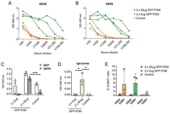 With the intention of compiling more data regarding the immunogenicity and the immune response triggered by POM formulations, our next step was to test them in another animal model, specifically in mice. To do so, BALB/c mice were inoculated twice 2 weeks apart with either 5 or 50 µg of GFP POMs. Administration of GFP POMs in mice induced long-term GFP-specific antibodies in a dose-dependent manner. Thus, only the 50 µg high dose induced significant levels of GFP-specific antibodies that were detectable two weeks after the second shot (SD35, first time point tested) and lasted at least nine weeks (SD85, last time point tested) (Figure 6A,B). The POM formulation of GFP induced significantly higher levels of GFP-specific IgG2 antibodies (Figure 6C), in accordance with what was observed in pigs receiving p30 POMs. Moreover, in this case, levels of IgG2 were also augmented, although not significantly, in mice receiving the high dose of 50 µg of GFP POMs (Figure 6C). Also, in line with what was observed in pigs, anti-GFP IgA was detected in mice serum only when prime boosting with 50 µg of GFP POMs, but not with 5 µg doses (Figure 6D). These results suggested the potential of POM formulations to induce mucosal immunity, as well as the dose dependence of the immune response induced. Two weeks after the second administration, half of the mice were sacrificed to analyze the cellular response induced by GFP POMs. Thus, splenocytes were isolated and stimulated in vitro for 5 days with 5 µg/mL of GFP POMs to be assayed for lymphoproliferative activity by flow cytometry, using the Ki67 proliferation marker. In vitro stimulation of splenocytes obtained from mice immunized with GFP POMs, either with 5 or 50 µg/dose, resulted in the specific proliferation of CD8+ T cells (Figure 6E). Despite the proliferation extent not being significantly higher, these data provide the first set of evidence that GFP POMs can induce memory CD8+ T cells in mice, even at low concentrations of antigen.