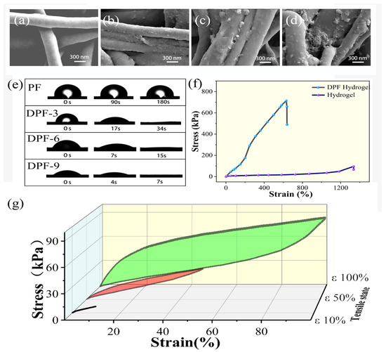 Figure 2e presents the infiltration test images of PF, DPF-3, DPF-6, and DPF-9. On the PF sample, after the droplet falls, a significantly large contact angle is observed at the moment of contact with the fiber network. In the next 180 s, there is no significant change in the contact angle, indicating the hydrophobic nature of PF. This phenomenon may be related to the fiber material and fiber network structure. By contrast, samples DPF-3, DPF-6, and DPF-9 exhibit significantly enhanced hydrophilicity. The fiber network is completely infiltrated in a short period, indicating that dopamine modification makes the fiber surface hydrophilic. With the increase in surface polydopamine content, the infiltration angle decreases when the droplet contacts the sample, and the complete infiltration time gradually shortens. Dopamine treatment enhances the hydrophilicity of the fiber network, facilitating better binding with the hydrogel precursor. This helps prevent internal bubbles in the hydrogel due to infiltration issues, thereby improving the performance of the DPF hydrogel sensor. Dopamine modification improves this material’s affinity and adhesion by introducing dopamine molecules to the material surface. In this process, dopamine, as an “intermediate molecule”, can bind with the fiber through its special adhesive properties. Due to the numerous active groups in dopamine, it can form intermolecular forces with large molecular chains and water molecules, facilitating the formation of an interface between the fiber and the hydrogel. This further enhances its mechanical properties and optimizes internal ion channels.