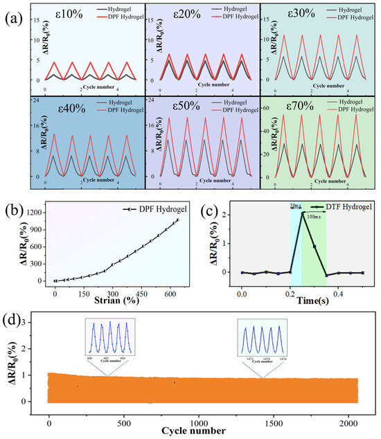 (a) Comparison of responsiveness between DPF hydrogel and hydrogel; (b) responsiveness of DPF hydrogel when subjected to draw fracture (0–640%); (c) sensor response speed of DPF hydrogel; and (d) DPF hydrogel tested at 10% elongation for 2000 draw cycles.