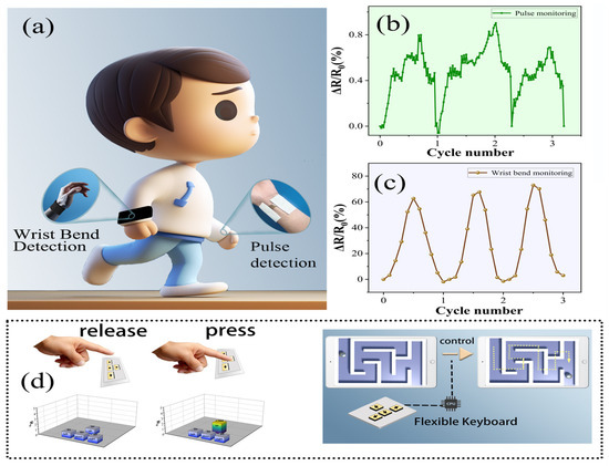 (a) Sensors for use in surveilling human physiological signals; (b) wearable sensors for use in monitoring pulse rates; and (c) wearable sensors for use in monitoring wrist flexion. (d) Integration of the DPF hydrogel in fabricating a flexible keyboard and its functional demonstration.