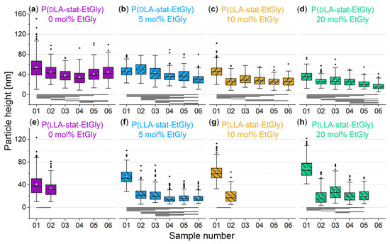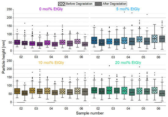An overview of the degradation times for the different PNPs, as measured using AFM can be found in Table 2. An exemplary AFM images before and after the degradation of SC-PNPs are presented in Figure S1. To ensure comparability among the different samples, the heights of the deposited particles on all substrates were measured prior to degradation and evaluated using a box plot. The initial situation is depicted in Figure 5. The six sets of samples, which correspond to each other and have the same EtGly content in the deposited particles, were compared to each other using ANOVA with the Dunn–Sidak test (p = 0.05). Statistically significant differences are marked with a connecting line below the boxes.