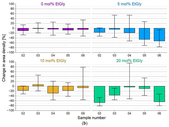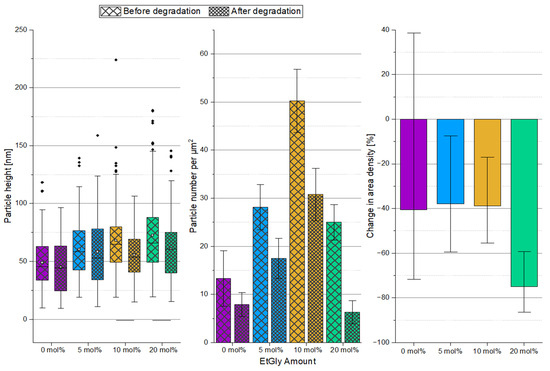 To further investigate the SC-PNP degradation, an additional experiment was conducted. In this experiment, the enzyme concentration was increased by a factor of 10 to 1 mg/mL and SDS solution was added to the proteinase K. Furthermore, the degradation test duration was set to seven days. Subsequently, the particle heights and the surface densities of the particles before and after degradation were evaluated and graphically represented, as shown in Figure 8. The particle heights showed minimal changes after degradation, with only a statistically significant difference observed for EtGly contents of 10 and 20 mol%. However, when considering the surface density of particles before and after degradation, a clear trend can be observed. After degradation, there are significantly fewer particles present on the substrate compared to before. Furthermore, the proportion of disappearing particles increases with a higher EtGly content, which might be due to the lower degree of crystallinity in the polymer. Based on the findings, it can be concluded that the SC-PNPs degrade in the presence of the proteinase K and appear to disintegrate either without or with minimal prior loss of size.