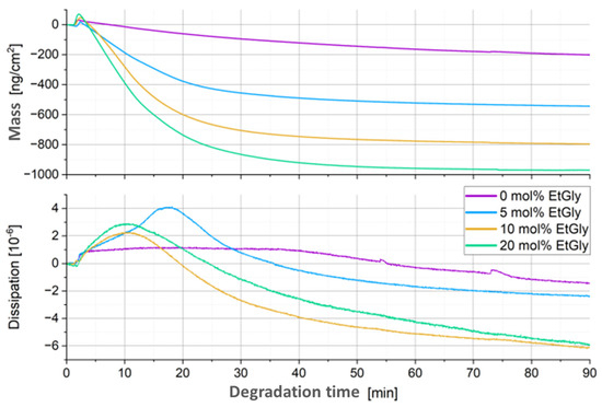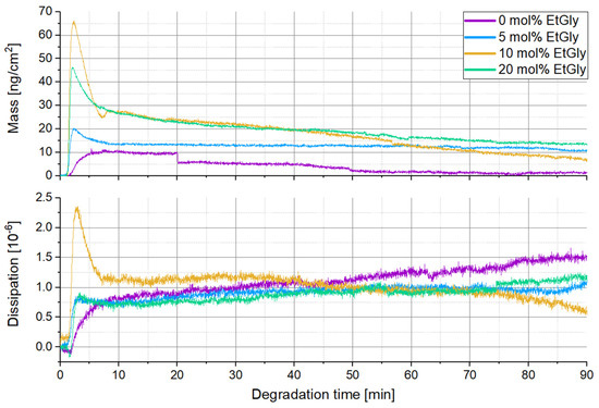 To further verify this, QCM-D measurements were conducted for the PlLA-PNPs. The procedure was the same as for the SC-PNPs, and the coverage of the Au chips was also confirmed using AFM. Furthermore, this additional experiment aimed to provide better insight into the prematurely terminated experiment of the PlLA-PNPs with 10 mol% EtGly. The results of the QCM-D measurements are shown in Figure 12. Here as well, the attachment of proteinase K is observed as an increase in mass and dissipation in the first few minutes [26,34]. Subsequently, the mass decreases, and the total mass loss is much greater than in the degradation of the SC-PNPs. Furthermore, the overall mass loss is greater with a higher EtGly content in the PlLA-PNPs. Increased enzyme attachment is also observed with a higher EtGly content, which can explain the greater mass loss. Table 4 provides an overview of enzyme attachment and degradation rates, which are similar to Table 3. The maximum measured masses are in the same order of magnitude as those of the SC-PNP (Table 4). However, the degradation rates of the PlLA-PNPs are much higher (especially at the beginning) than those for the SC-PNPs. It is clearly noticeable that at the beginning (first column of the degradation rates—the next five minutes after the maximum measured mass), the rate is higher with a higher EtGly content or enzyme attachment. In the last ten minutes of the measurement, this trend completely reverses, indicating that the faster degradation process observed at the beginning is likely completed earlier. Contrary to the observations made using AFM, it appears that the EtGly content does not inhibit but rather accelerates degradation. When examining the trend of dissipation, it also seems that the EtGly content has an influence on the strength of the particles during degradation. In the case of pure PlLA-PNPs without EtGly, the increase and subsequent decrease in dissipation are minimal compared to the trend observed in all PlLA-PNPs with higher EtGly contents. Therefore, a PlLA-PNP with a higher EtGly content should exhibit greater stiffness after degradation compared to before degradation and even compared to the pure PlLA-PNPs without EtGly.