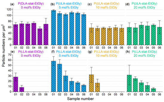 In addition to particle heights, we also considered the surface density of the substrates covered by the PNPs. The assessment of surface densities for all samples during degradation is presented in Figure 11. For samples containing PdLA-PNPs (Figure 11a–d), the surface density displays only minimal fluctuations, irrespective of the EtGly content, and remains generally constant. This supports the assumption of biostable particles that do not undergo significant degradation, aligning with the existing literature findings [9]. For the evolution of surface density for PlLA-PNPs during degradation (Figure 11e–h), a noticeable decrease in particle count is observed with increasing degradation times across all samples. Notably, the second sample of PlLA-PNPs, with a 5 mol% EtGly content, exhibits the highest particle coverage. This likely explains why particles were still present on this sample even after 24 h. Initially, the coverage on the other three samples was approximately consistent, around 30 particles per µm2. When comparing the extent of the decrease, it becomes evident that the reduction in surface density is impeded with higher EtGly contents. Whereas pure PlLA is known to be rapidly hydrolyzed, the presence of EtGly suggests that the polymer PEtGly is somewhat more stable against hydrolysis compared to PlLA [9,26,29]. However, it should be noted that, based on our observations, it is not fully biostable like pure PdLA.