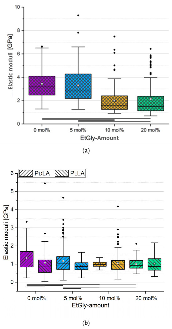 The results are presented in the box plots displayed in Figure 13a,b. A representative measurement curve is provided in Figure S5. For SC-PNPs, a clear trend emerges: a higher EtGly content correlates with a reduced elastic modulus. This aligns with the theory [18] that EtGly introduces steric hindrance into the polymer, hindering the stereocomplexation process. Consequently, the nanoprecipitation yields more amorphous and less crystalline components, resulting in softer SC-PNPs with a higher EtGly content. Whereas not all samples displayed statistically significant differences, the overall trend appears linear, especially when considering the median line. The mean values of the SC-PNPs with 5 and 20 mol% EtGly contents is influenced by outliers, pulling them upward. In the case of PNPs without stereocomplexation, we compared PdLA-PNP and PlLA-PNP samples and also assessed differences within PNPs with the same EtGly contents. Statistically significant distinctions were primarily observed in PNPs with low EtGly contents. It appears that PdLA-PNPs with low EtGly contents tend to be stiffer, but this difference diminishes as the EtGly content increases.