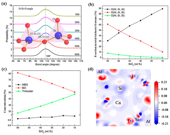 - Bi, Z.; Li, K.; Jiang, C.; Zhang, J.; Ma, S.; Sun, M.; Wang, Z.; Li, H. Performance and transition mechanism from acidity to basicity of amphoteric oxides (Al2O3 and B2O3) in SiO2–CaO–Al2O3–B2O3 system: A molecular dynamics study. Ceram. Int. 2021, 47, 12252–12260. [Google Scholar] [CrossRef]