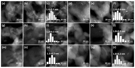 DF-TEM images of samples 1 (a–c), 2 (d–f), 3 (g–i), 4 (j–l), 5 (m–o), and 6 (p–r). Insets: statistical particle size distribution of samples 1–6 according to the main frame image.