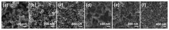 HR-FESEM images of samples 1 (a–c) and 2 (d–f).
