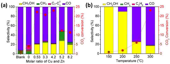 CO2 conversion and selectivity for samples 1–6 having different molar ratios of Cu and Zn at 300 °C (a) under the same conditions for sample 4 (b) at temperatures from 150 to 300 °C. Reaction conditions: H2/CO2 ratio of 4, total flow 4 mL/min, 40 bar, 40 mg catalyst. Blank test: no catalyst.