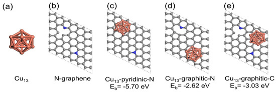 Optimized structural models of: (a) Cu13; (b) N-graphene including two N (blue) defects: pyridinic-N (top-left) and graphitic-N (bottom-right); (c) Cu13 adsorbed on pyridinic-N atom; (d) Cu13 adsorbed on graphitic-N atom; (e) Cu13 adsorbed on graphitic-C atom. Corresponding adsorption energies indicated as Eb for models (c–e). Brown, grey, and blue represent Cu, C, and N atoms, respectively.