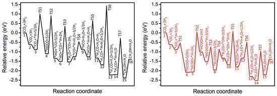 Therefore, subsequent intermediates and transition states of CO2 conversion to methanol were studied on 4-9 Cu-Cu sites for the Zn1Cu12 cluster on N-doped graphene. Based on reported studies [76,77], two main reaction pathways for CO2 conversion to methanol were considered in our calculations: the (i) RWGS+CO+hydro pathway: RWGS reaction to produce a CO intermediate followed by its hydrogenation to methanol and (ii) formate pathway: initial hydrogenation of CO2 to a *HCOO intermediate followed by its hydrogenation and dissociation to methanol. As will be commented below, and in agreement with previous studies [76,77], the present calculations also show the preferred formate pathway on ZnCu/C-N via *HCOOH, *H2COOH, and *CH3O intermediates over the RWGS+CO-hydro pathway for methanol synthesis (Figure 5 and Table S15).