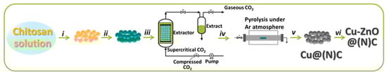 Procedure used to prepare the Cu-ZnO@(N)C samples under study. (i) Precipitation in NaOH solution of chitosan hydrogel; (ii) water/ethanol exchange and Cu(OAc)2 impregnation; (iii) supercritical CO2 drying to remove ethanol; (iv) pyrolysis in Ar atmosphere to obtain Cu@(N)C; (v) Zn(OAc)2 impregnation; (vi) thermal treatment.
