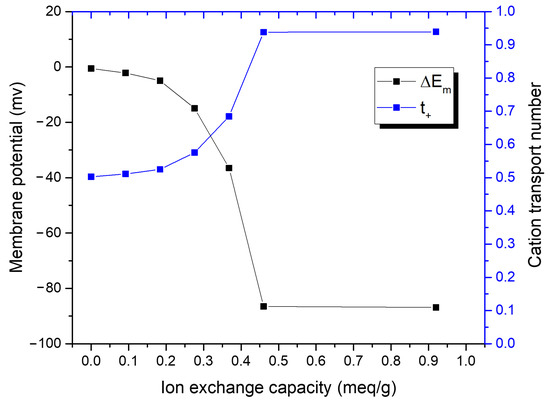 In exploring the functionality of IEMs with varying Nafion contents, our investigation delves into the nuanced relationship between ion exchange capacity (IEC) and permselectivity. Contrary to the traditional belief that a higher IEC is indispensable for optimal permselectivity [18,19,20], our findings, aligned with recent studies, demonstrate that membranes with lower Nafion content can also exhibit high selectivity [21]. This observation suggests that, particularly for our PVDF–Nafion blend membranes, excellent permselectivity may be achieved without the necessity of high IEC levels. The examination of the IEMs’ functionality commenced with the calculation of the IEC for each blend, as shown in Table 1. These IEC values were derived employing the equation IEC = 1000/EW, where EW, equivalent weight, was calculated from the Nafion ratio in each blend [22].