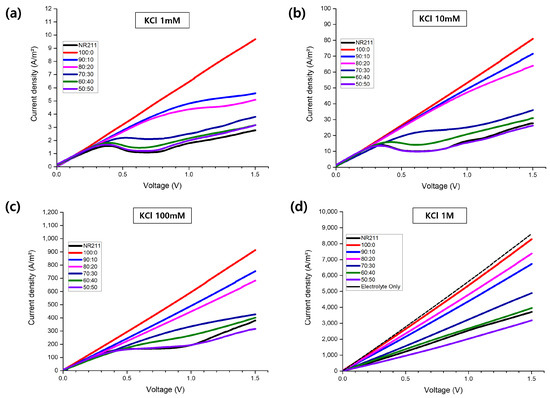 Current density–voltage characteristics of PVDF–Nafion blend membranes, illustrating the membranes’ performance in different electrolytic environments: (a) 1 mM KCl, (b) 10 mM KCl, (c) 100 mM KCl, and (d) 1 M KCl.
