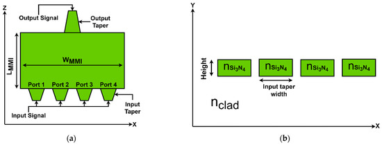 10]. The multiplexer’s design is based on the principle of multimode interference (MMI), which allows for the uniform distribution of light from multiple input ports toward the output port via the self-imaging effect [