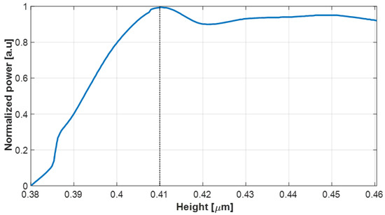 4 strip waveguide, which is 410 nm, in the design of the MMI multiplexer. It is important to note that heights exceeding 0.41 µm do not lead to a major decrease in power, and the normalized power was maintained above 90% for any increase in height up to 0.46 µm. However, increasing the thickness of the Si