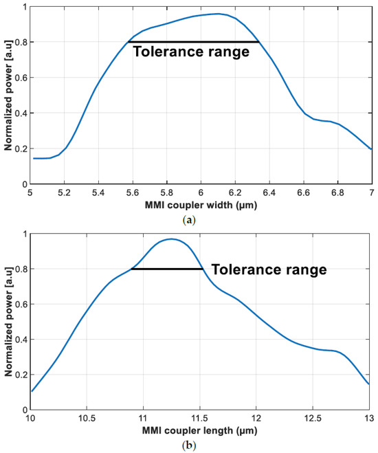 Figure 5b. These findings provide valuable insights into the precise design specifications necessary to fabricate the MMI coupler, which in our case has large stability regarding error fabrication because of the larger tolerance range of ±300 nm.