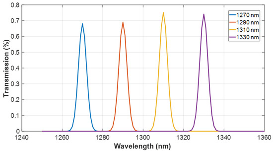 Figure 9 shows the transmission spectrum of our four-channel MMI multiplexer. These spectra are taken for each port separately, and the monitor was placed at the output port. The transmission efficiency is illustrated for each operational wavelength, achieving 68% for 1270 nm, 69% for 1290 nm, 75% for 1310 nm, and 74% for 1330 nm. This figure highlights the multiplexer’s ability to achieve high transmission with minimal insertion loss. Notably, the spectra also reveal excellent channel isolation, attributed to the device’s design that ensures a significant spectral separation between adjacent channels, with 20 nm channel spacing. The sharp, well-defined peaks indicate there is no cross-talk between channels and confirm the device’s high wavelength selectivity, which is crucial for its application in dense wavelength division multiplexing systems.
