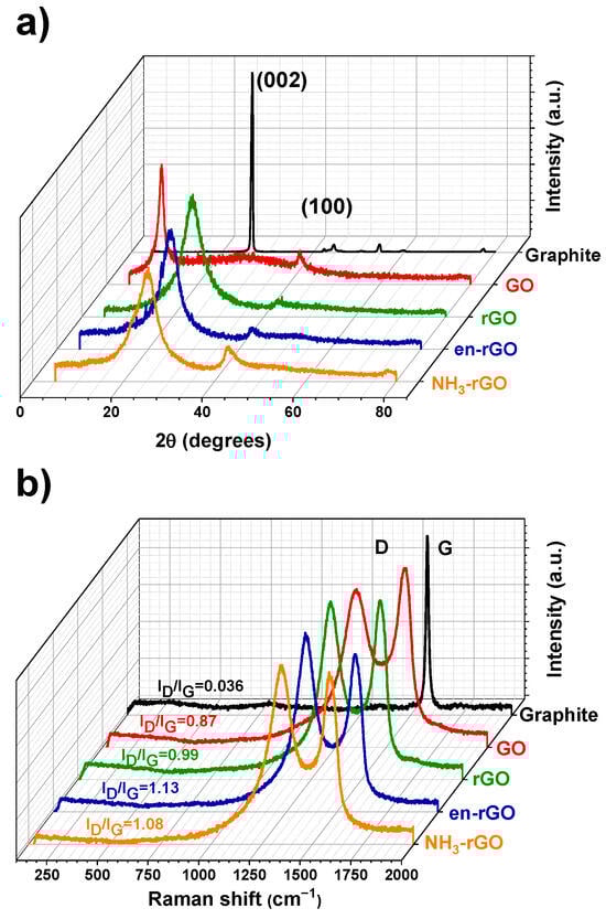 A crucial stage in the production of graphene-based materials from graphitic oxide (GO) involves ensuring the complete reduction of this material. Therefore, the assessment of structural measurements becomes essential for evaluating the proper preparation of the samples. The X-ray diffraction (XRD) pattern of the GO, rGO, en-rGO and NH3-rGO samples and the pristine graphite, from which the synthesis of the other intermediates and final products starts, are shown in Figure 1a. The XRD pattern for commercial graphite provided two characteristic peaks of the graphite phase (JCPDS-PDF 12-0212) at ~26° and 41° (2θ), assigned to the 002 and 100 crystallographic planes, respectively []. After oxidation to GO, the reflection peak located at 26° (2θ) was shifted to a smaller angle, specifically at 11° (2θ), verifying an increase in the interlaminar spacing due to the insertion of functional groups and, therefore, confirming the correct exfoliation. Moreover, this peak was shifted again to ~26° (2θ) in the reduced samples, recovering the original position of the 002 plane in graphite, but with a remarkable broadening of the peaks that indicates a loss of crystallinity in the graphene sheets []. Raman spectra (Figure 1b) showed two characteristic bands at 1560 and 1360 cm−1, corresponding to G and D bands, respectively. The G band stands for the stretching vibration E2g mode, while the D band originates from defects within the structure of the graphite []; therefore, the ratio between the intensity of both bands (ID/IG) determines the degree of disorder. ID/IG ratios for the graphite, GO, rGO, en-rGO and NH3-rGO samples were 0.036, 0.87, 0.99, 1.13 and 1.08, respectively, which confirmed a high ordering in the lamellar structure of commercial graphite, a slight increase in disorder in the GO sample and a deeper increase in disorder in the reduced samples []. These values are notably high when compared to other carbons, particularly those derived from biomass [,].