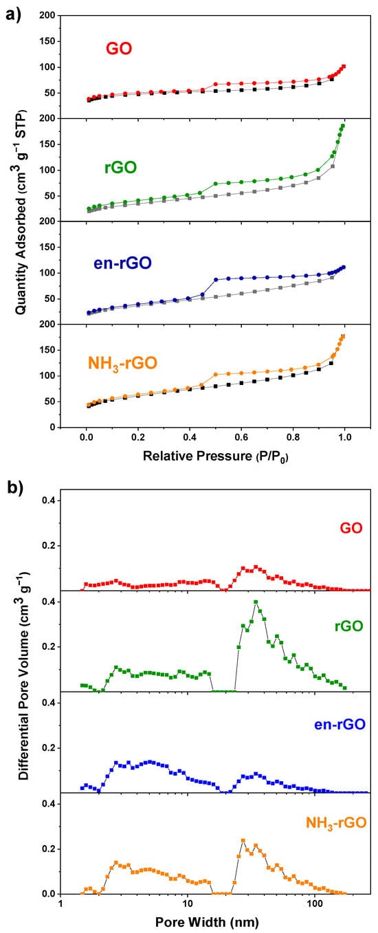 (a) Nitrogen adsorption/desorption isotherms and (b) pore size distribution of the GO, rGO, en-rGO and NH3-rGO samples.