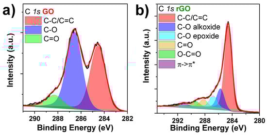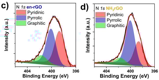 X-ray photoelectron spectroscopy (XPS) measurements provide information on the chemical environment and composition of the samples. In Figure S1a, the XPS survey of the different samples reveals the presence of C1s and O1s signals across all samples. Furthermore, in the case of the nitrogen-functionalised samples (en-rGO and NH3-rGO), an additional signal appears due to the contribution of N1s. In the C1s region of the GO sample (Figure 4a), there is a noticeably lower intensity in the C-C/C=C component compared to the rGO sample (Figure 4b), accounting for a contribution range of 42.5% to 64.4%. In contrast, more pronounced C-O interactions resulted for the GO sample due to the oxidation process and the presence of functional groups between the sheets of the GO structure. However, for the rGO sample, the C-O and C=O interactions decrease notably, accompanied by the emergence of π → π* interactions and a marked increase in the C-C interaction. These observations confirm an effective reduction of GO during the synthesis process of the samples. Additionally, C1s spectra are represented for en-rGO and NH3-rGO samples in Figure S1b,c, displaying a similar chemical environment to the rGO sample []. Moreover, Figure 4c,d depict the N1s spectra for the en-rGO and NH3-rGO samples, respectively, identifying three types of well-differentiated chemical environments corresponding to pyridinic, pyrrolic and graphitic nitrogen discernible at 398.6, 400.1 and 401.8 eV, respectively []. The proportions of these environments vary depending on the specific functionalising chemical agent. In the case of the sample prepared using ethylenediamine (en-rGO), the analysis reveals values of 9.02% for graphitic nitrogen, 45.49% for N-pyrrolic and 45.49% for N-pyridinic. Conversely, the sample synthesised with ammonia (NH3-rGO) exhibited different proportions: 6.82% for graphitic nitrogen, 58.96% for N-pyrrolic and only 34.22% for N-pyridinic. These results demonstrate a higher content of pyridinic nitrogen in the en-rGO sample, while the NH3-rGO sample exhibits a higher proportion of pyrrolic nitrogen []. As a complementary technique, a CN elemental analysis was performed on the reduced samples to determine the amount of carbon and nitrogen. In detail, the nitrogen content in rGO, en-rGO and NH3-rGO samples was 0.95, 9.21 and 9.41%, respectively.