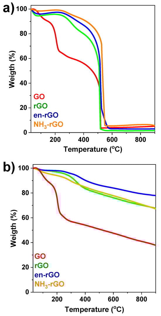 Additionally, to gain deeper chemical insights into the thermal behaviour and composition of the samples, thermogravimetric analysis (TGA) was performed. In the case of measurements carried out under an oxygen atmosphere (Figure 5a), a pronounced decline in weight was observed above 350 °C for the rGO, en-rGO and NH3-rGO samples, aligning with carbon contents of 78.5%, 76% and 75%, respectively. Notably, the mineral matter content of all samples showed values below 5 wt.% and is attributed to impurities present in the commercial graphite used as the starting material. Additionally, a minor weight loss, occurring between 250 °C and 350 °C for the reduced samples (rGO, en-rGO and NH3-rGO) was attributed to the gradual loss of residual functional groups that still persisted in the structure, accounting for approximately 15%, 17% and 14% of the total weight, respectively. This percentage was notably lower compared to the GO sample, where functional group loss happened between 100 °C and 300 °C, with a content of around 35% []. The thermograms presented in Figure 5b under a nitrogen atmosphere exhibited a characteristic pattern for this type of sample, confirming comparable percentages of functional groups related with the weight loss observed between 200 and 400 °C. This alignment reinforces the finding from XPS analysis, highlighting the presence of a minimal proportion of residual functional groups in the graphene-based materials.