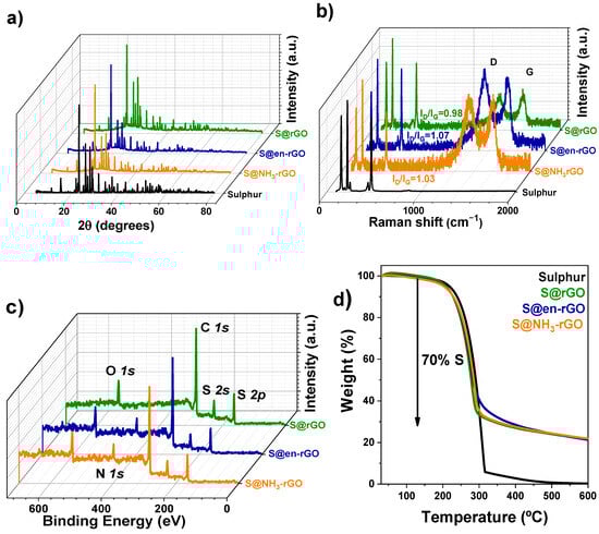 Following the analysis of the graphene-based samples, sulphur was introduced via the melt-diffusion method to form the sulphur composites (S@rGO, S@en-rGO and S@NH3-rGO). Various characterisation techniques, including XRD, Raman, XPS and TGA were employed to confirm sulphur’s presence within the structure, understand its chemical environment and determine the percentage of sulphur integrated into the pores of the graphene matrix (Figure 6). The evaluation of structural properties by XRD (Figure 6a) revealed multiple reflections assigned to the crystalline phase of orthorhombic sulphur (JCPDS-PDF 85-0799). These signals appeared intense and narrow, indicating a highly crystalline structure. Furthermore, a slightly broad band around 26° (2θ) corresponding to the disordered carbon of the graphene material used as a matrix is also appreciable. However, the Raman spectra (Figure 6b) prominently exhibited the D and G bands typical of disordered carbonaceous samples. In addition, Raman measurements confirmed the presence of elemental sulphur through three high-intensity signals below 500 cm−1, corresponding to characteristic orthorhombic S peaks (150, 219 and 474 cm−1) []. In the XPS spectra (Figure 6c), the signals related to the appearance of sulphur demonstrated its presence, and in Figure S2, the signal S2p has been highlighted to study the environment of the sulphur in the sample, where three signals appeared. Firstly, there was a doublet corresponding to S2p3/2 and S2p1/2 with an energy separation of 1.2 eV, indicating possible presence of C-S species. There was also a signal that could be ascribed to sulphates species []. EDX analysis, shown in Figure S3, was also carried out on the samples, indicating the existence of nitrogen in the composites based on the functionalised graphene-based samples. A homogenous dispersion of the sulphur in the composites, which is explained by the use of the melt-diffusion method, was also responsible for the formation of little particles of sulphur that facilitate the electrochemical performance of the electrodes []. Finally, once the presence of sulphur in the composite samples was verified, the amount of fixed sulphur in the graphene matrix was determined accurately using TGA. Figure 6c shows a weight loss stage occurring approximately between 200 °C and 400 °C, attributed to the sublimation of sulphur. This analysis revealed a consistent 70% by weight of elemental sulphur within the S@rGO, S@en-rGO and S@NH3-rGO composites. These results agree with the proportion of sulphur utilised during the preparation of these composite materials.