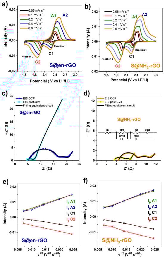 Cyclic voltammograms at 0.05, 0.1, 0.2, 0.4 and 0.6 mV s−1 between 3.0 and 1.5 V for (a) S@en-rGO and (b) S@NH3-rGO electrodes; impedance spectra of (c) S@en-rGO and (d) S@NH3-rGO electrodes, and the proposed equivalent circuit; graphical representation of peak intensity versus sweep speed elevated to a half for (e) S@en-rGO and (f) S@NH3-rGO electrodes.