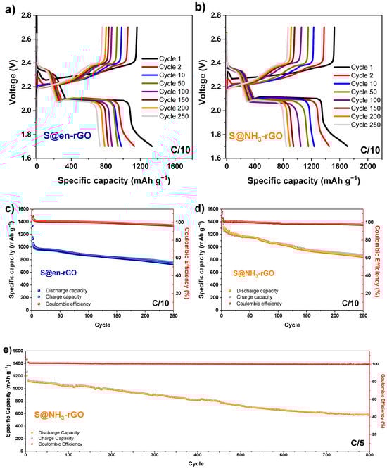 Charge/discharge profiles at a C/10 rate for 1, 2, 10, 50, 100, 150, 200 and 250 cycles with (a) S@en-rGO and (b) S@NH3-rGO electrodes. Long-term discharge/charge capacity values as a function of the cycle number and the Coulombic efficiency for (c) S@en-rGO and (d) S@NH3-rGO electrodes at a C/10 rate, and for (e) S@NH3-rGO electrode at a C/5 rate.