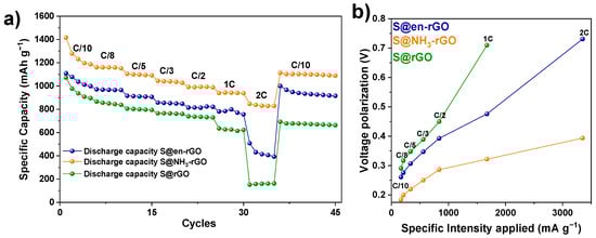 (a) Specific discharge capacity values as a function of the cycle number at C/10, C/8, C/5, C/3, C/2, 1C and 2C rates. (b) Values of the voltage polarisation as a function of the specific intensity applied for S@en-rGO, S@NH3-rGO and S@rGO electrodes.