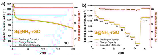 (a) Long-term cycling and Coulombic efficiency at a 1C rate over 200 cycles. (b) Values of the specific discharge capacity and Coulombic efficiency as a function of the number of cycles at C/10, C/5, C/2, 1C, 2C, 5C, 10C, 12C and 15C rates for the S@NH3-rGO electrode.