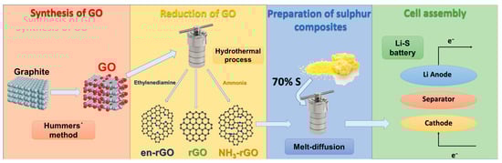 The previous graphene-based samples were mixed with sulphur using the melt-diffusion method to obtain the composite samples. To do this, the carbon and sulphur precursors were predried in a vacuum oven (Buchi, Flawil, Switzerland) at 120 and 45 °C, respectively, to completely remove moisture. The samples were then placed in an inert atmosphere glove box (MBraun 150, München, Germany). Once inside, the selected graphene-based material was homogeneously blended with sulphur in a weight ratio of 30:70 (rGO:S), a fitting proportion often considered suitable for studies in Li-S batteries. The resulting mixture was then transferred into an autoclave. Subsequently, the autoclave was heated in an oven at 155 °C for 24 h. Finally, the composite samples were ground manually until the particle size was homogenised. The composites were denoted as S@en-rGO, S@NH3-rGO and S@rGO [].