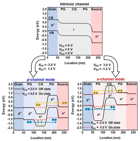 Figure 2 shows the energy band diagrams of the TG FBFET with a p+-i-n+ structure. The channel mode is determined by the voltage polarity applied to the two PGs; a positive gate bias induces electrons (n*), whereas a negative gate bias induces holes (p*) in the channel region. When VPG = −3 V and VCG = 2 V, the channel region is doped electrostatically to form a p*-n*-p* structure and operates in the p-channel mode. The energy level of the p* region near the drain is reduced due to hole injection from the drain, which is responsible for the difference between the energy levels in the two p* regions, even with the same VPG of −3 V. Initially, the potential barrier created by the electrostatic doping of VPG and VCG blocks the injection of charge carriers from the drain/source regions into the channel region. However, as VCG sweeps from 2 V to 0 V with a drain-to-source voltage (VDS) of 1.2 V, holes are injected from the drain into the channel regions through the lowered potential barrier. The accumulation of holes in the p* region near the source lowers the potential barrier for electrons, allowing electrons to flow from the source to the channel regions. These electrons accumulated in the potential well of the n* region further lower the potential barrier for holes and accelerate hole injection into the channel region. The continuous injection and accumulation of charge carriers lead to the collapse of the potential barriers, activating the positive feedback (PF) loop and switching the device to the on state with the latch-up phenomenon. Here, the VCG at which the latch-up phenomenon occurs is defined as the latch-up voltage. For the n-channel mode, an electrostatically induced n*-p*-n* doping structure is formed in the channel region at VPG = 3 V and VCG = −2 V. The difference in the energy levels of the two n* regions with the same VPG is due to the injection of electrons from the source region, which increases the energy level in the n* region adjacent to the source region. While VCG sweeps forward from −2 V to 0 V at a source-to-drain voltage (VSD) of −1.2 V, the continuous interaction between charge carriers and potential barrier induces a PF loop, leading the device to switch to the on state through the latch-up phenomenon. Once the PF loop is activated, the on state is maintained until the charge carriers in the channel region are removed. To turn off the device via the latch-down phenomenon, it is necessary to eliminate the PF loop, which is achieved by applying a sufficient VCG, defined as the latch-down voltage required to release charge carriers inside the channel region. The TG FBFET maintains the on state before eliminating the PF loop such that it has a memory window in the transfer curve.