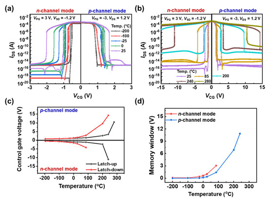 Transfer characteristics of TG FBFET in the n-channel and p-channel modes at (a) low and (b) high temperatures. Dependence of (c) latch-up/down voltages and (d) memory window on temperature change.