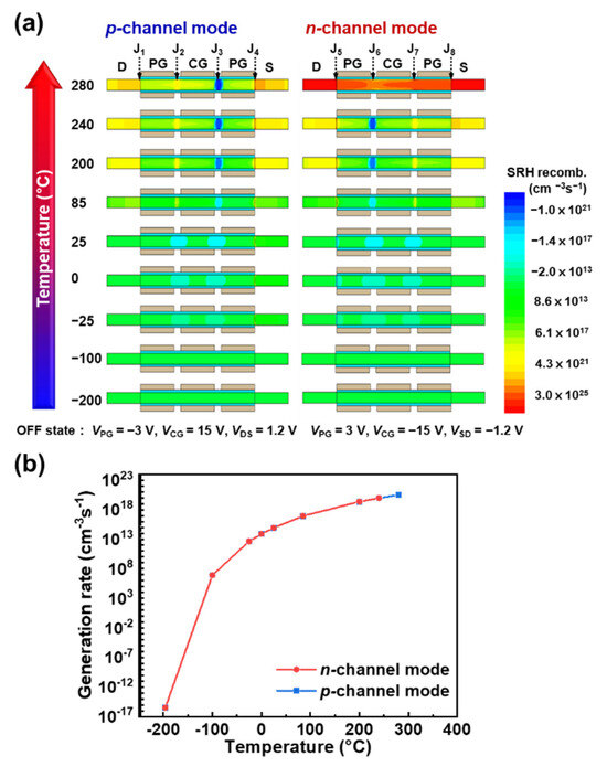 Contour maps of the electron–hole recombination and generation of the TG FBFET at various temperatures are shown in Figure 5a, where the negative and positive signs of the SRH recombination rate indicate the generation and recombination rates, respectively. The simulation results agree well with the thermal generation mechanism shown in Figure 4. The contour map of the n-channel mode at 280 °C represents high SRH recombination, indicating that the potential barrier collapses owing to the thermally induced PF loop. The electron–hole generation rates at J3 for the p-channel mode and J6 for the n-channel mode increase exponentially with increasing temperature, as shown in Figure 5b. Moreover, at high temperatures, the recombination rates increase at J2 and J4 in the p-channel mode (at J5 and J7 for the n-channel mode) because the electrons and holes have sufficient kinetic energy to surpass the potential barrier, so that they recombine at the drain and source regions. This also accounts for the extensions of the drain and source described above.