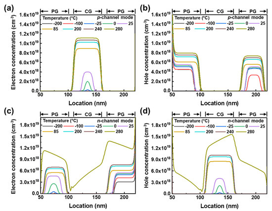 To investigate the effect of temperature on the distribution of carriers in TG FBFETs, we analyzed the electron and hole concentrations in the intrinsic channel in the off state. Here, the electron and hole concentrations in the off state represent the thermally generated charge carriers. Charge carrier accumulation due to the high thermal energy in the p-channel mode was confirmed by the electron and hole concentrations shown in Figure 6a,b. The electron concentration in the potential well under the CG increases rapidly from 1.45 × 10−8 cm−3 to 1.12 × 1019 cm−3 as the temperature increases from −200 °C to 280 °C. Similarly, the hole concentration increases from 1.35 × 103 cm−3 to 7.34 × 1018 cm−3 in the potential well under the PG close to the source region. Moreover, in the n-channel mode, a potential well for holes is formed in the CG and a potential well for electrons is formed in the PG close to the drain region, because the polarity of VPG is opposite to that of the p-channel mode. As shown in Figure 6c,d, the electron concentration increases from 0.37 × 102 cm−3 to 6.91×1018 cm−3, while the hole concentration increases from 0.47 × 102 cm−3 to 1.01 × 1019 cm−3, with temperature increases from −200 °C to 240 °C. When the temperature is 280 °C, the high concentrations of electrons and holes throughout the channel indicate that the channel becomes conductive due to the collapse of the potential barrier caused by the thermally induced PF loop. Figure 6b,c show that the holes (electrons) from the drain (source) region injected via isotype junctions J1 (J8), as shown in Figure 4, contribute to the increase in the hole (electron) concentration in the p-channel (n-channel) mode in the channel region under the PG close to the drain (source) region.
