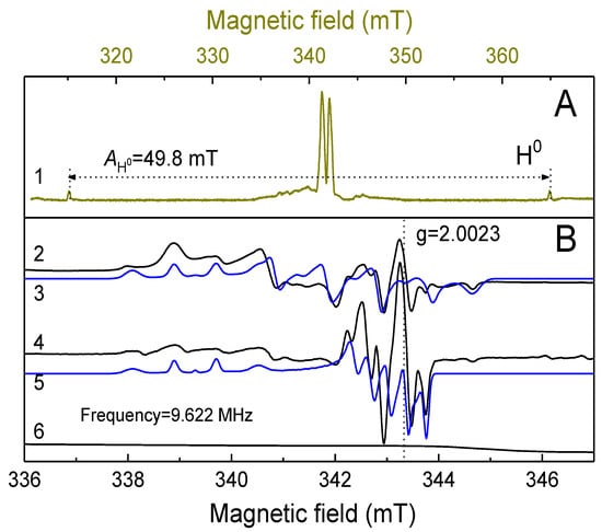 In the spectra recorded in the pulse mode (spectrum 1, Figure 2A), by measuring the intensity of the electron spin echo, as well as in CW mode it is possible to detect (isolate from other types of paramagnetic centers) trapped atomic hydrogen centers H0 (doublet due to the nuclear magnetic moment of proton I = ½, therefore 2I + 1 = 2, with the characteristic splitting of about 49.8 mT) [36]. Considering the XRD results (Figure 1), the results of our previous studies of TCP [30], and recent EPR investigations of various calcium pyrophosphate polymorphs [36], we suggest that the observed hydrogen is trapped in the impurity phase Ca2P2O7. Unfortunately, the short transverse electronic relaxation time of the paramagnetic centers observed in pulse mode (T2e = 2 ± 0.5 microseconds at T = 300 K) prevents the identification of other paramagnetic centers (the lines in the vicinity of the magnetic fields of 336–348 mT) using the pulse mode of the spectrometer in the same manner as that shown in ref. [30].