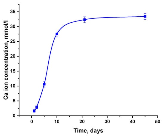The B-TCP ceramic was soaked in a saline solution with TRIS buffer at pH 7.4 and 37 °C. The experiment involved immersing the samples of B-TCP ceramics in the solution for 1, 2, 5, 10, 20, and 45 days. After each specified time, the calcium content in the solution was measured, and the solubility curve is presented in Figure 4. As can be observed, at the first stage of dissolution, the concentration of calcium ions increased due to the solubility process; then, after 30 days, the curve reached a plateau, which indicated the establishment of a dynamic equilibrium between calcium ions transferred to physiological solution as a result of ceramics dissolution and calcium ions removed from solution due to the formation of a layer of biological apatite on the surface of ceramics, according to the reaction (3):