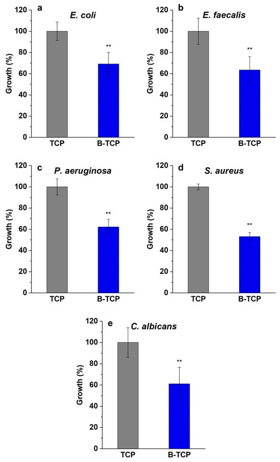Growth (%) and standard deviation (SD) for (a) E. coli, (b) E. faecalis, (c) P. aeruginosa, (d) S. aureus, and (e) C. albicans cultured in the presence of TCP and B-TCP. The reported values were obtained from three independent experiments and expressed as mean percentage values ± SD, compared to growth in the presence of TCP, considered as a control set at 100%. p values (Dunnett test): p < 0.01 ** compared to positive control.