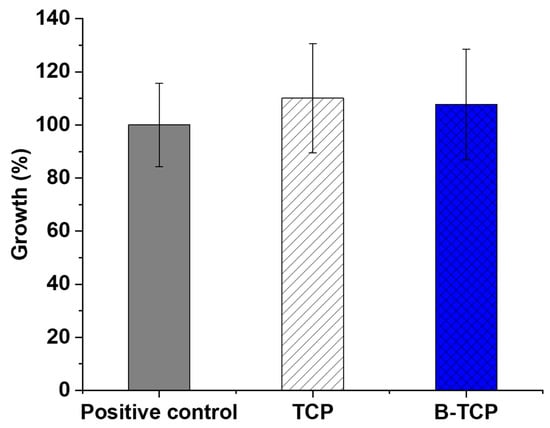 Assessment of growth (%) for aMSCs under different conditions: alone, in the presence of TCP, and B-TCP at 24 h, incubated at 37 °C, using MTT assay. The reported values were obtained from three independent experiments and expressed as mean percentage values ± SD compared to the values of the positive control corresponding to 100%.