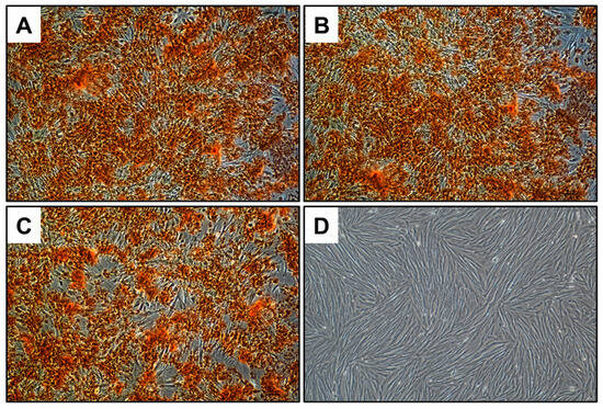 aMSCs cultured in growth medium served only as the negative control, while those cultured in osteogenic differentiation medium acted as the positive control for the experiment. Each experiment was repeated in triplicate, and cells were incubated at 37 °C with 5% CO2, with medium changes every two to three days for a duration of 3 weeks. Red calcified deposits were visualized by staining with Alizarin Red S (Sigma-Aldrich, Edinburgh, UK), highlighted in red. Cell images were captured using an inverted optical microscope (Nikon, Eclipse T2000-U, Hamburg, Germany).