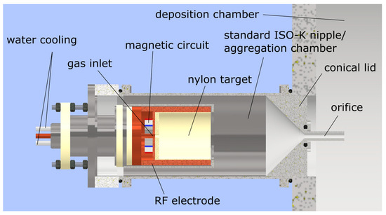 The investigated NPs were deposited from a GAS based on a semi-hollow magnetron, in a set-up identical to the one described in Ref. [37] (Figure 1). The magnetron was prepared with a nylon 6,6 target (Goodfellow) with a 5 mm thick base and 1 mm thick cylinder walls. The magnetron was placed inside a standard ISO KF100 tube, capped with a conical lid and terminated with a tubular orifice (5.8 mm in diameter and 50 mm long), which together formed the aggregation chamber. The source was connected to a high-vacuum deposition chamber pumped using diffusion and rotary pumps.