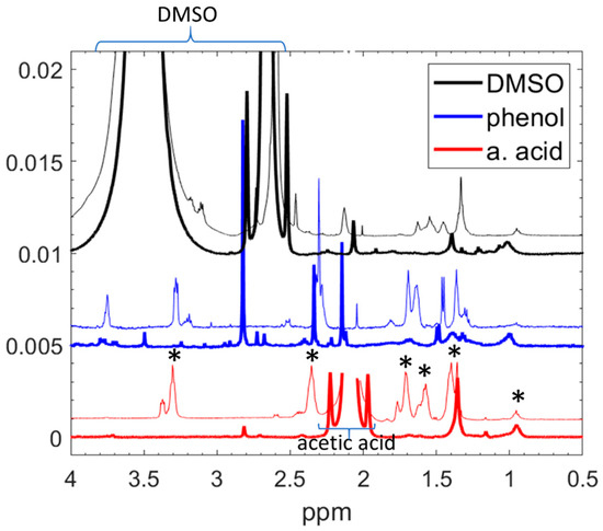 To enhance the solubility and select the most suitable solvent for obtaining high-resolution NMR spectra, we dissolved the NPs in acetic acid, DMSO, and a 5 wt% phenol solution in water. Figure 4 compares the spectra of the NPs (bold lines) and the pure nylon 6,6 material. The solubility in the acetic acid and DMSO was comparable, while the NPs were less soluble in phenol than in either acetic acid or DMSO. The main reason for choosing acetic acid was because both the NP and the nylon spectra gave well-resolved peaks, which were easy to assign. Nevertheless, the distinctions between the NPs and nylon, as elaborated later, remain discernible in all solvents. Given that the nylon peaks in acetic acid (marked by stars in Figure 4) were the most sharply resolved, did not overlap with the solvent peaks, and could be completely assigned to corresponding chemical groups (indicated by the red curves), this solvent was used for further analysis.